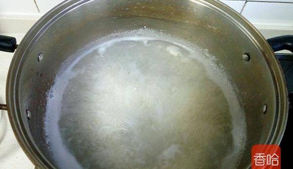 4.鍋中加清水,水開後加大米。再次煮沸後,轉小火繼續熬煮,期間不停攪動,加幾滴色拉油小火熬煮。水和米的比例大概是這樣:80克米,我傢的飯碗大概是半碗,我加瞭5碗水。大傢可以根據食材多少自己調整。