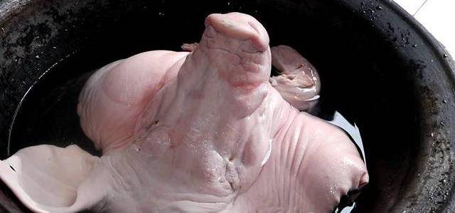 買豬頭的時候,讓商販把豬頭幫忙劈開。首先把豬頭上面的淋巴去掉,把豬耳朵和豬鼻孔一定要註意洗幹凈,用刀在豬身上刮一刮,最後用清水洗凈。(豬舌頭根部也是會有淋巴的,大傢在清洗的時候一定要註意洗幹凈瞭。)