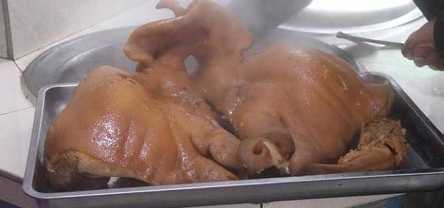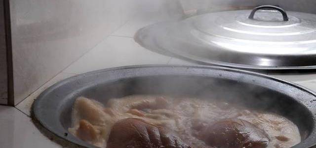 豬頭撈出後,用刀在皮上面刮一刮,把豬頭上面沒有洗幹凈的贓物清洗幹凈。