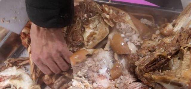 豬頭鹵到筷子紮進去沒有血水往外面流,拆掉豬頭上面的骨頭,把豬頭肉放進鍋內繼續鹵,加鹽調味。
