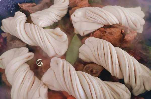第5步,鍋中燉煮20分鐘之後加入豆角,胡蘿卜,土豆塊,稍微翻拌均勻,接著再把花卷放在上面,蓋上蓋子燜煮10分鐘以上,燜煮好就可以出鍋啦。