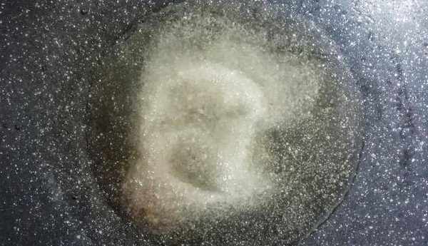 第四步、鍋中倒入5ML的食用油,油熱後倒入100g的白糖,將白糖炒出糖色。