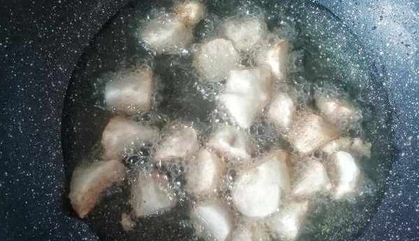 第三步、鍋中倒入150ML的食用油,油七成熱後,倒入山藥塊,炸至兩面金黃。然後,撈出山藥,控幹油,裝盤備用。