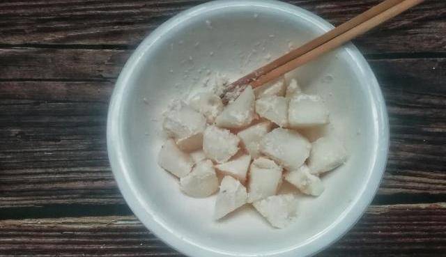 第二步、將山藥塊倒在盆中,再倒入20g面粉,將山藥與面粉攪拌均勻,保障每塊山藥上都裹上瞭面粉。