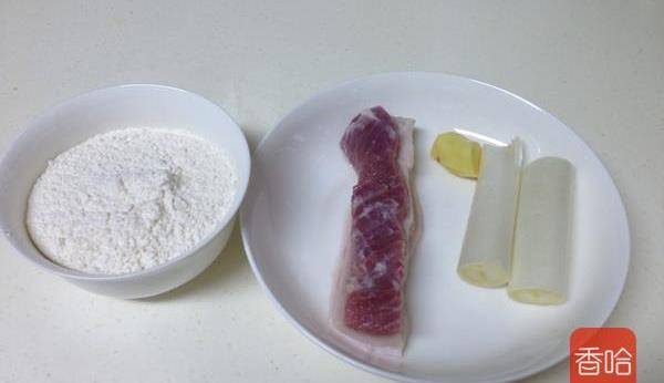 五花肉100克、蔥白兩段、薑一小塊、面粉100克、鹽適量、生抽適量、料酒適量、香油適量、老抽適量、食用油適量
