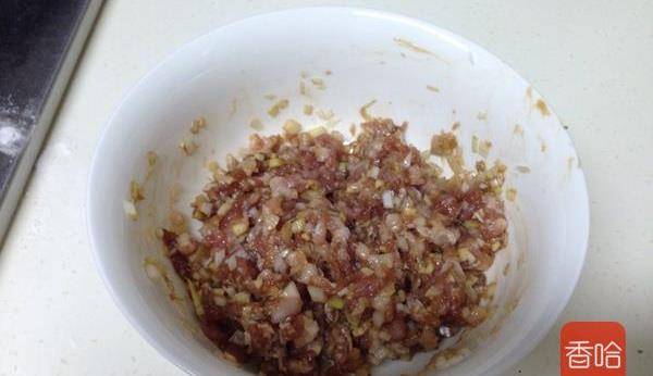 5.肉末和蔥薑末,放入料酒、生抽、老抽、鹽、香油和成餡料