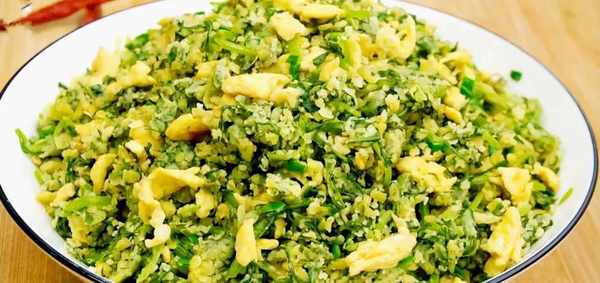 3、準備一把蒜苗切碎裝入碗裡,另取一個小碗,打入兩個雞蛋攪散開,油熱以後倒入雞蛋液,把雞蛋炒碎,再把蒸好的茼蒿倒進來,加入鹽,十三香。再放一點雞精,翻炒均勻,最後放入切好的蒜苗,炒出蒜香味兒就可以瞭。