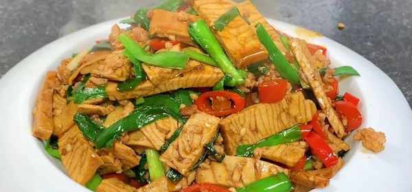1、香幹豆腐切成薄片,切點蒜片,薑片,幾個紅辣椒切成圈,肉末裝入碗裡面備用。