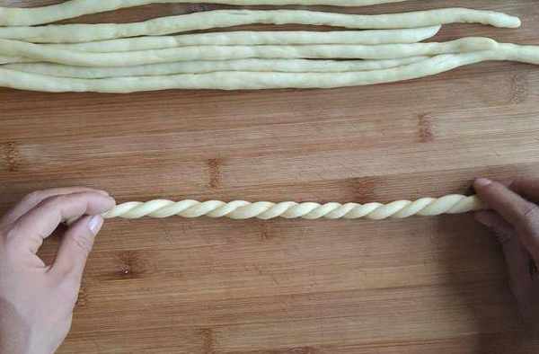 把面團切好放在一邊用保鮮膜蓋上防止面被風幹,同是也能騰出位置來搓麻花。拿一塊切好的面搓成細長條,一個個的排好放在不礙事的地方,搓好的細條用手抓住一頭,另一隻手往一個方向搓上勁,抓著的那隻手千萬別動,搓好以後兩隻手快速靠在一起,第一遍勁上好再重復一下剛剛的動作搓上勁,收回來就完成瞭麻花的制作。