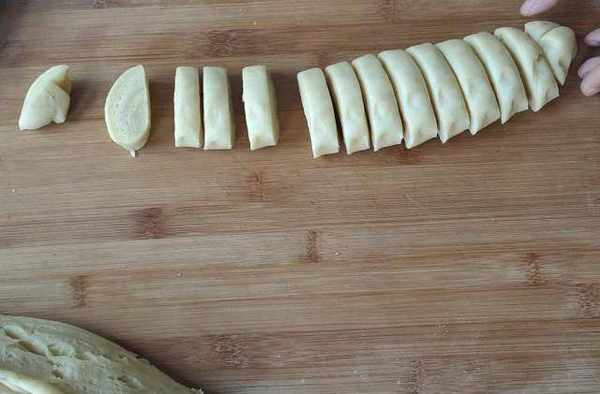 面粉搓好和成面團,放在案板上揉5-6分鐘,用保鮮膜包起來,放到溫暖的地方發酵25分鐘,面團發成原來的兩倍的大即可。發好的面團揉至表面光滑,用刀分成幾等份搓成長條,再改一下刀切成15左右的小面團。