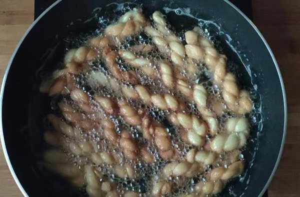 麻花全部搓好以後鍋裡倒上油燒至5-6成熱,把搓好的麻花放進去炸,中間要多翻動以免一邊炸過瞭,兩面炸的黃色即可撈出,別炸很黃的時候再撈,因為肉眼看著好瞭撈的時間麻花已經炸過瞭,撈出來也變黑瞭,這一點一定要註意。