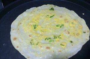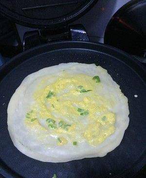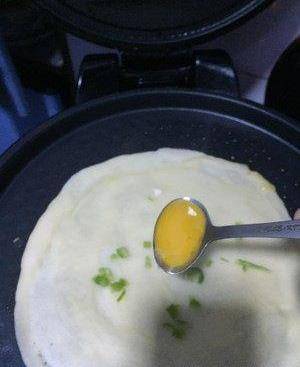 稍等片刻後放蔥花適量,並將準備好的蛋液適量舀到面餅上攤開
