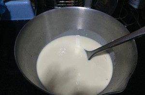 雞蛋兩隻和涼水,鹽混合一起攪勻後加面粉攪成面糊。另外一隻雞蛋磕入另一碗中待用。