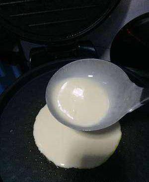 盛飯勺舀面糊半勺倒入電餅鐺中,並用鏟子攤開,攤勻面糊。