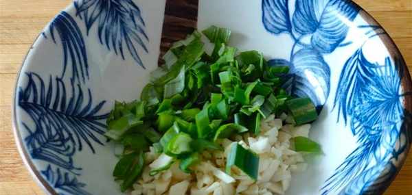 5:準備4-6瓣大蒜,剁成蒜苗,裝入碗中;再備點小蔥,同樣裝入碗中。