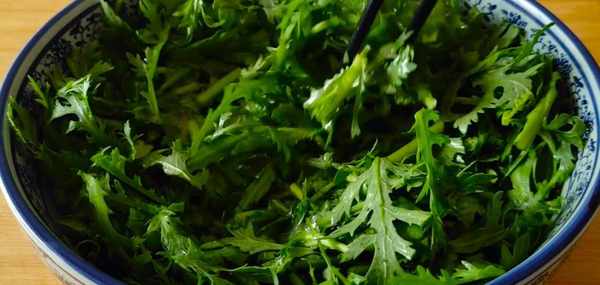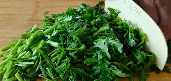 1:準備1把茼蒿,摘去較老的根尖,用清水洗凈,再拿刀切成小段。