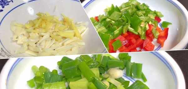 4:大蒜直接拍碎;生薑切成細絲;青紅辣椒切成小塊;小蔥切段備用。