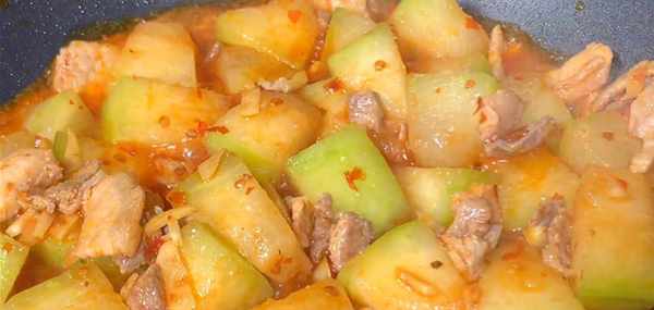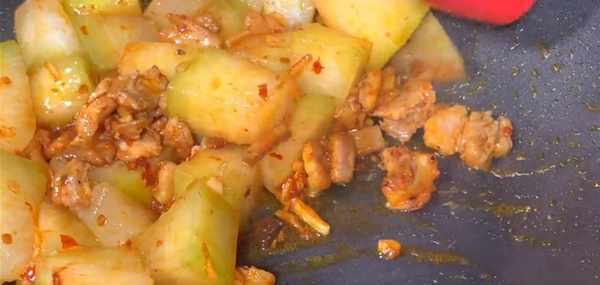 8:冬瓜炒香後,加入1碗清水,翻炒幾下,蓋上蓋子,大火燜3分鐘。