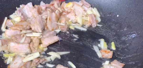 6:起鍋燒油,下入肉片翻炒,炒至變色後,再下入蔥末薑絲爆香。