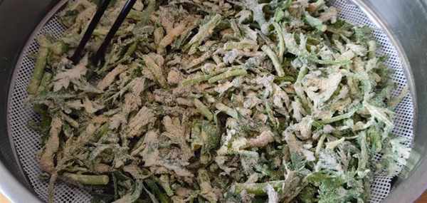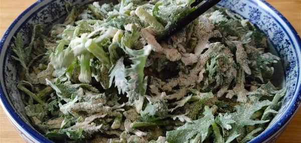 4:鍋中燒開水,將茼蒿平鋪到蒸屜上,蓋上蓋子,開大火蒸10分鐘。