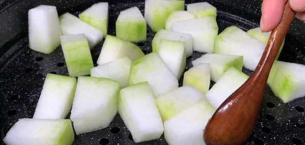 2:鍋中水開後,放上蒸屜,下入冬瓜塊,蓋上蓋子,用大火蒸5分鐘。