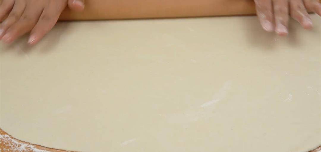 6:撒上少許面粉,搟成一張大面皮,再修成長方形的形狀,攤開在桌面上。