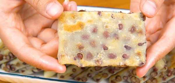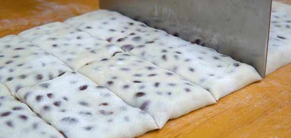 8:捏住面皮包裹住紅豆,再稍微碾薄一點,用刀切成小塊,放另一旁備用。