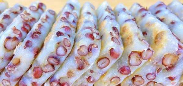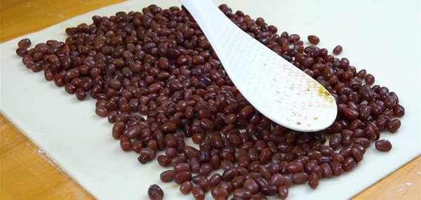 7:紅豆煮熟後,撒入紅糖,攪拌均勻,再放到面皮上,均勻地平鋪開。