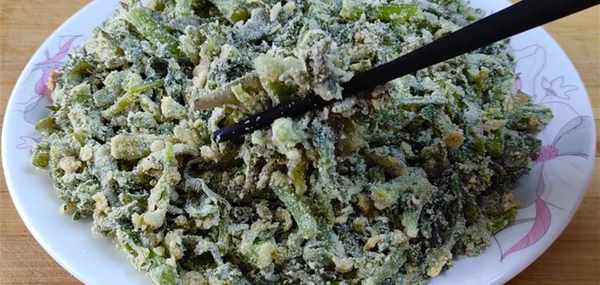 4:倒入適量開水,快速攪成面疙瘩,加點花生油增香,繼續攪拌均勻。