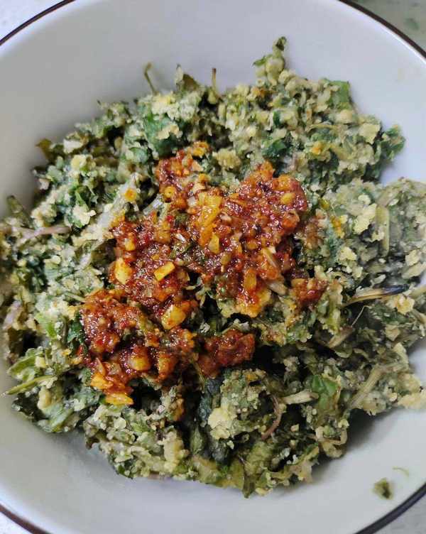第五步:切碎的蒲公英放入蛋液中,攪拌均勻。