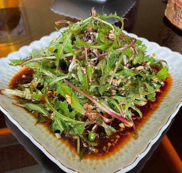 【食材】蒲公英300g、大蒜少許、花生碎末少許、麻油少許、鹽少許、雞精少許、芝麻醬2大勺。