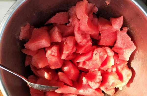 取一個甘甜起沙的西瓜,用勺子把西瓜瓤搗碎。