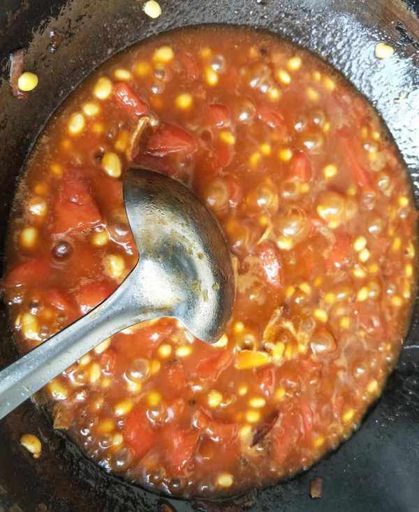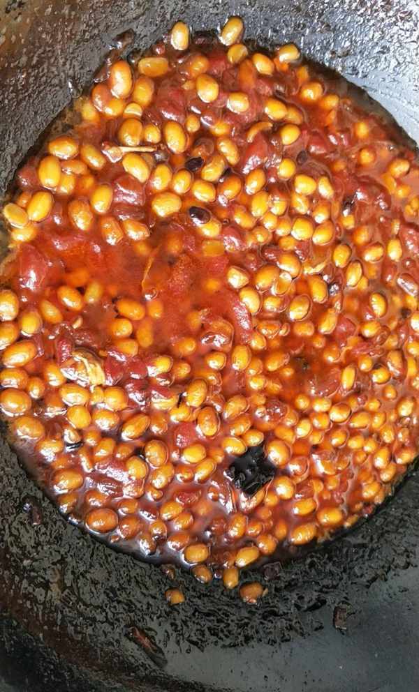 用密漏把大料撈出並倒入黃豆,加入2勺黃豆醬和2勺紅油豆瓣醬,翻炒出紅油倒入西瓜瓤,按1斤黃豆4斤西瓜的比例添加,翻拌均勻後,開中小火煮40分左右,期間要不停的攪拌,防止粘鍋糊鍋。