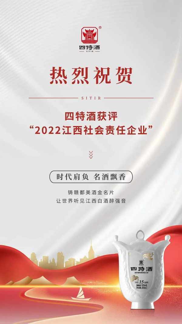4月26日,“義利天下·2022江西社會責任企業(企業傢)”推選活動定評名單公示期結束,80傢企業入選2022江西社會責任企業,10名企業傢入選2022江西社會責任企業傢。此次活動由江西日報社(江西報業傳媒集團)、省農業農村廳、省國有資產監督管理委員會、省地方金融監督管理局共同主辦。四特酒榮獲“2022江西社會責任企業”稱號,以實際行動踐行“自強不息,厚德載物”的企業精神,傳遞江西美酒榜樣力量,再次彰顯省酒龍頭擔當。