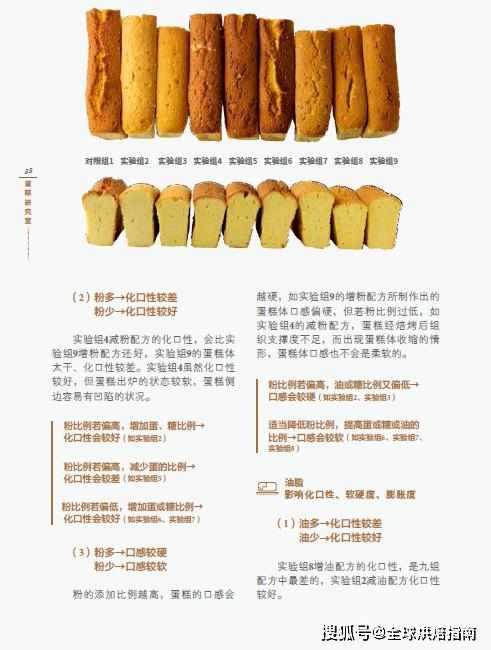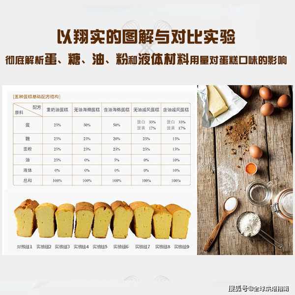 配方結構與調整將"重奶油蛋糕"配方中的油25%改為0%,使蛋比例新增至50%,則可成為"無油海綿蛋糕"的基礎配方。