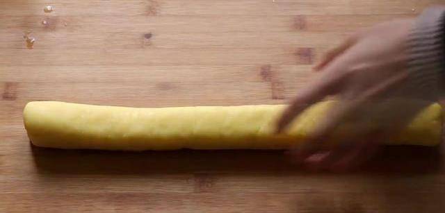 篩入200克的低筋面粉,翻拌均勻,翻至沒有幹面粉,下手捏搓,讓面粉和油能充分融合,均勻後移到案板上,整理一下,搓成長條,包上一層保鮮膜。