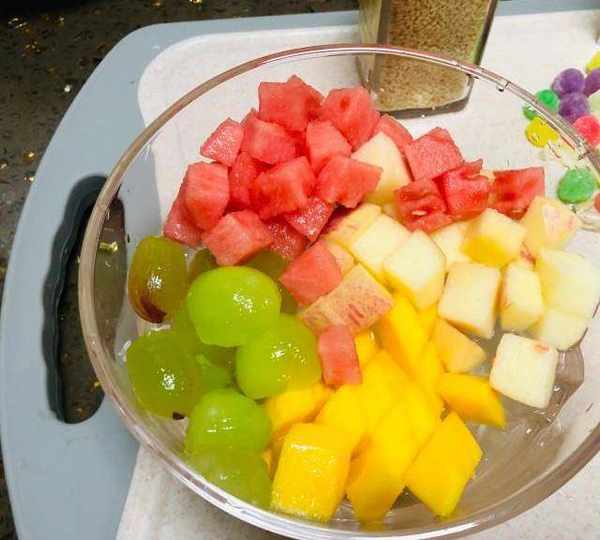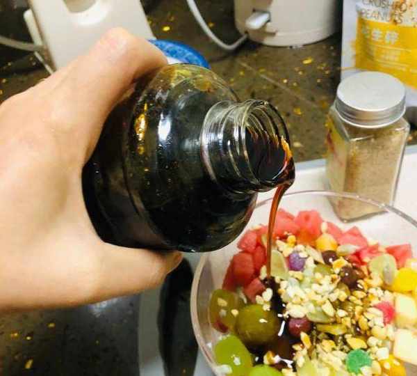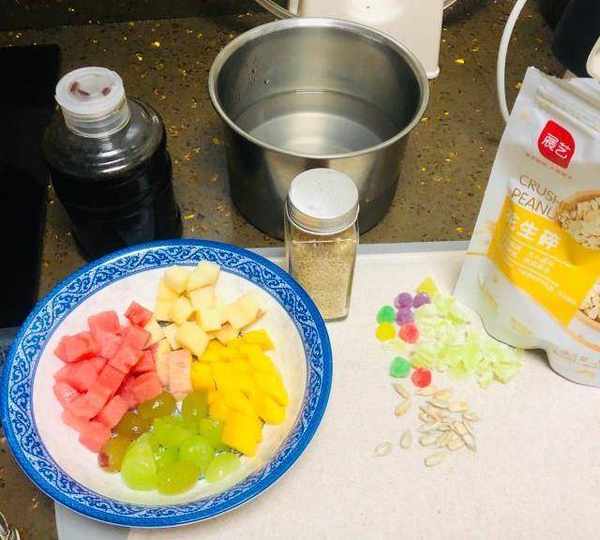 原料:白涼粉、西瓜、芒果、葡萄、蘋果、花生碎、葵花籽仁、冬瓜糖、彩虹糖、葡萄幹、紅糖汁、白芝麻。