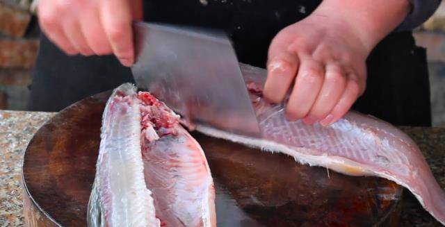 步驟:1、草魚殺瞭之後把表面粘液刮一下(能有效地減少腥味)。在魚的尾部開一刀順著魚骨推到魚頭,把魚頭砍開。