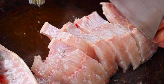 魚鰭提起來砍掉魚頭,魚牙撬掉,然後把魚頭稍微剁一下,肉切成魚條。