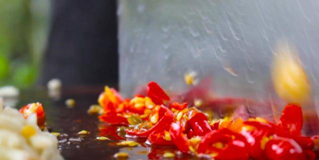 3、醃魚的時候我們來處理其它食材。大蒜拍一下剁成蒜末,泡椒也剁碎,老薑拍碎切成薑末。