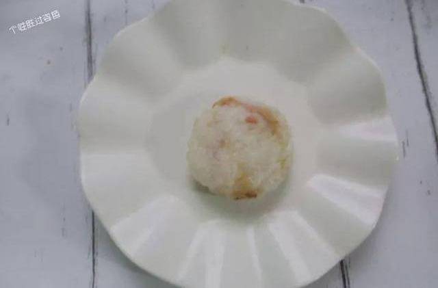 3、溫水打濕手部,舀一大勺米飯放手心壓扁,放入芝士碎;沒有芝士碎可以放入紅豆餡等