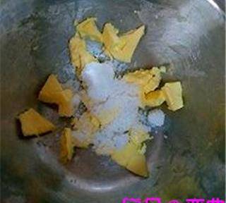 2、黃油軟化後放入盆中,用刮刀拌勻;