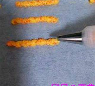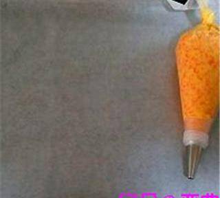 7、把面糊裝入裱花袋中,剪小口,在烤盤上擠成細長條;