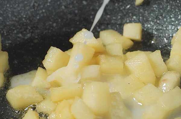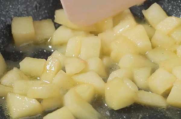 3、加點糖、水淀粉,蘋果丁炒軟變粘稠。