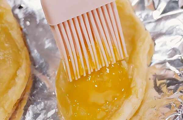 6、同時分離出蛋黃打散,蛋黃液刷在烤好的脫殼的蛋撻皮上。