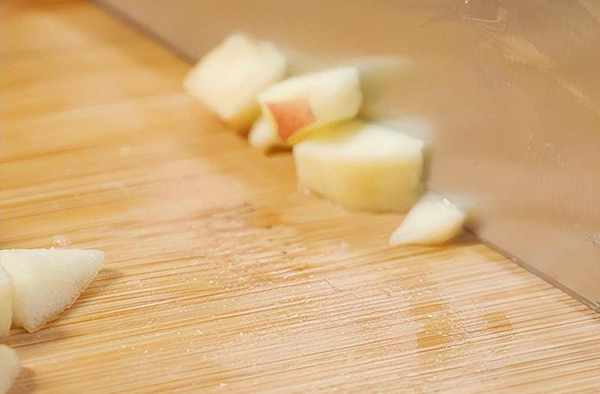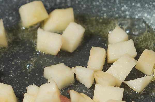 2、鍋中放黃油,加熱融化,加入蘋果丁翻炒。