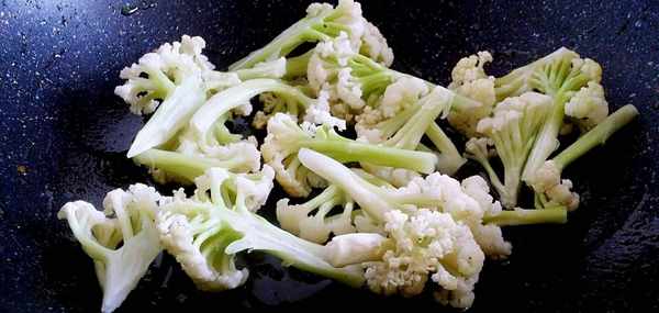 然後需要開始熱鍋冷油,再入花菜進行翻炒,待其稍變色後,就可以加入兩大勺的生抽和少許的水進去瞭,再用大火將其燒開後,再轉小火繼續慢燉。