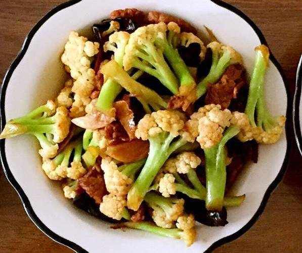然後需要將木耳進行提前泡發兩小時,再洗凈備用,而花菜需要洗幹凈後汆水,再備用。