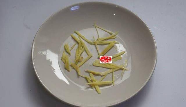 1、將老薑去皮,切成細絲,盤裡放薑絲