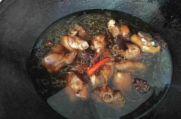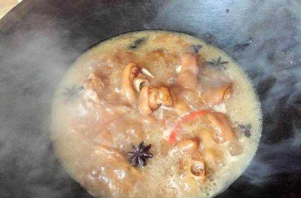8、待豬腳上色後馬上加水,水量以沒過豬腳為宜,大火燒開。
